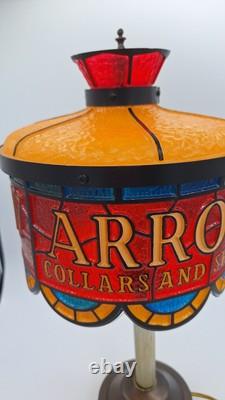 Vintage Arrow Collars and Shirts faux stained glass adjustable lamp. Metal lamp base with plastic shade adjusts below the socket to allow the lamp to either sit on a flat surface or hang on the wall. Lamp is in good vintage condition with minor blemishes (see photos). Shade is in good vintage condition with no cracks, breaks or holes. Lamp measures approximately 17 1/2" tall from the base to the top of finial, and 8" at the widest point.
